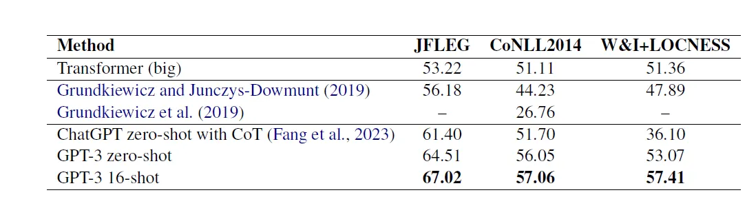 Paper | Is ChatGPT a Highly Fluent Grammatical Error Correction System?A Comprehensive Evaluation | ChatGPT or Grammarly? Evaluating ChatGPT on Grammatical Error Correction Benchmark | Exploring Effectiveness of GPT-3 in Grammatical Error Correction: A Study on Performance and Controllability in Prompt-Based Methods | GrammarGPT: Exploring Open-Source LLMs for Native Chinese Grammatical Error Correction with Supervised Fine-Tuning |
